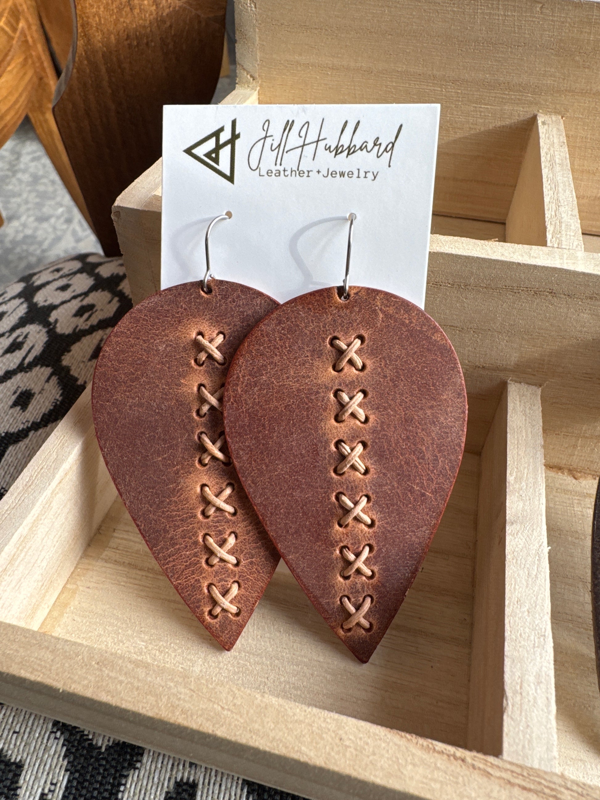 Vegetable-tanned leather leaves, accented down the center with leather cord cross stitches. Surgical steel ear wires. Hang ~3" long and measure 1.5" wide.